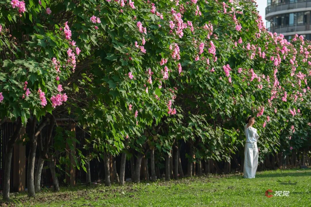 10月15日,成都双流航港路洪江路口,成片的芙蓉花迎来盛花期,吸引了市民驻足观赏、拍照打卡 摄影/C视觉 李佳